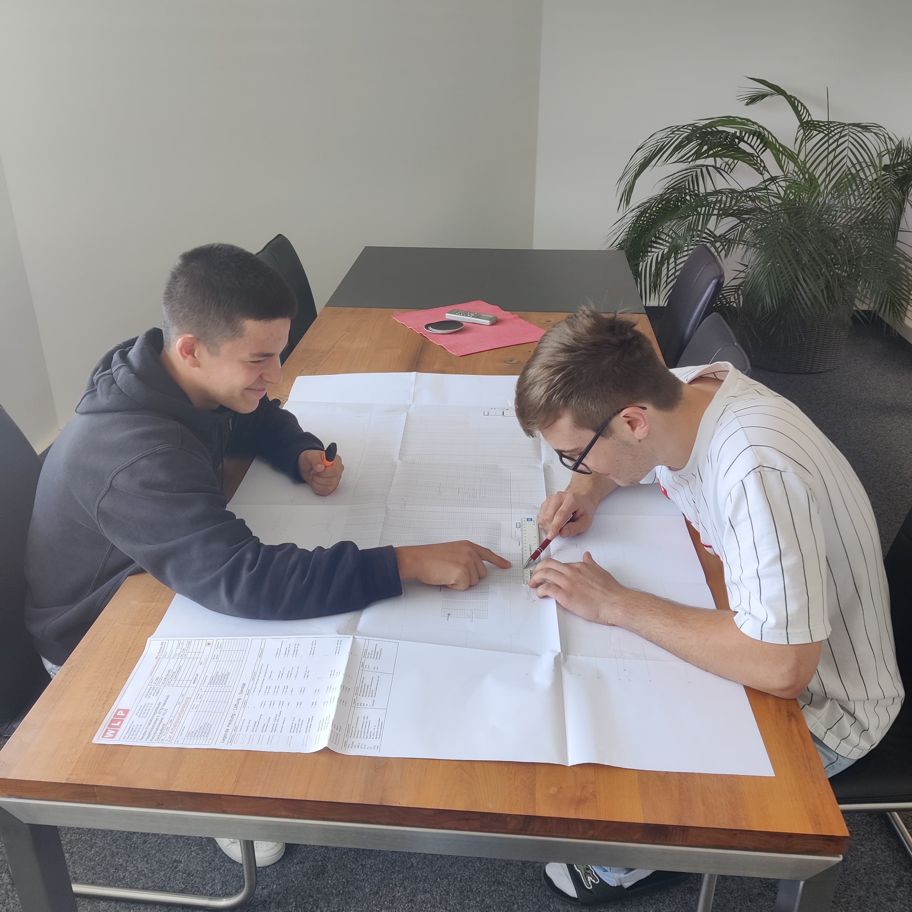 Gabriel de Sousa (links im Bild) macht seine 4-jährige Lehre als Gebäudetechnikplaner Fachrichtung Sanitär bei der WLP.