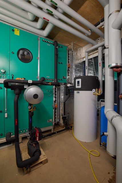 Wärmeerzeugung mit einer Luft-/Wasserwärmepumpe und Wärmeabgabe mit Fussbodenheizung